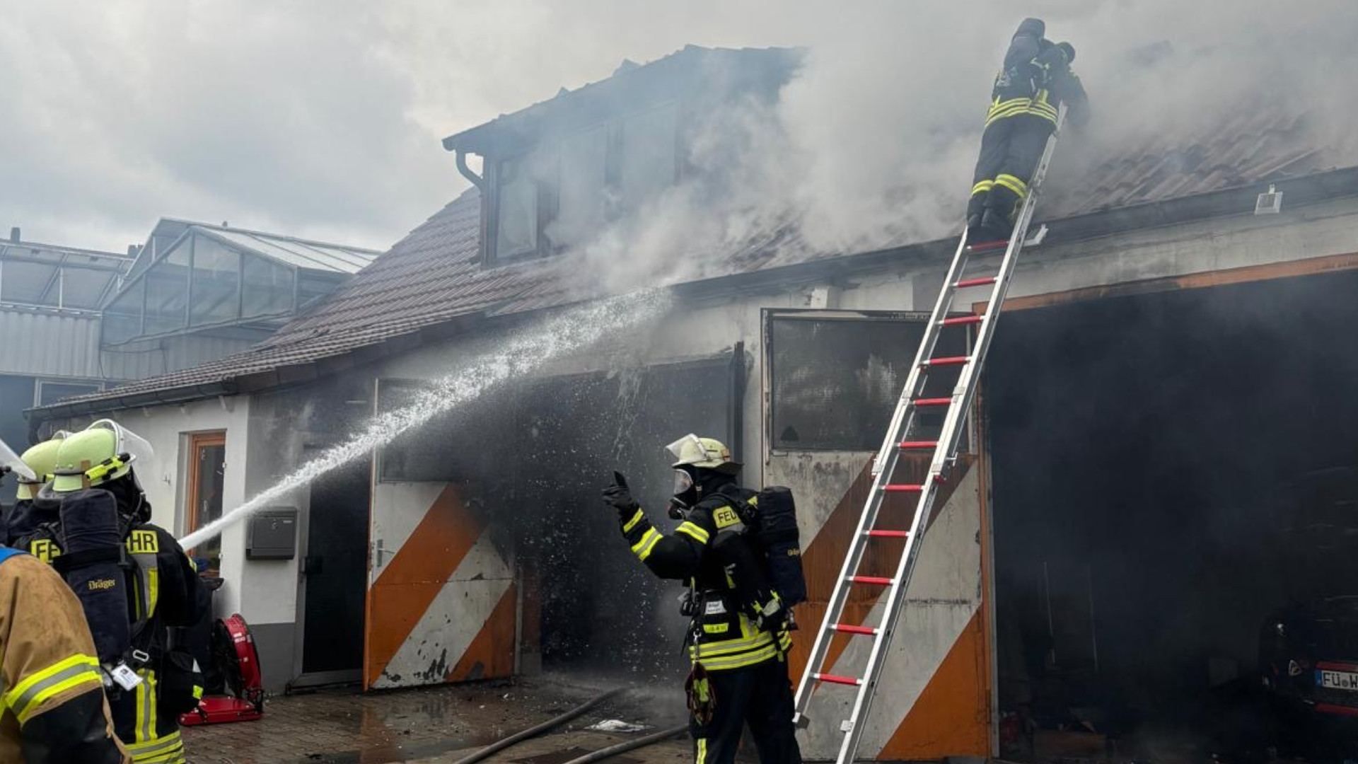 Bereits auf der Anfahrt war eine deutliche Rauchentwicklung sichtbar. Beim Eintreffen standen Teile des Werkstattbereichs in Flammen, zudem war das angrenzende Bürogebäude vom Brandgeschehen betroffen.