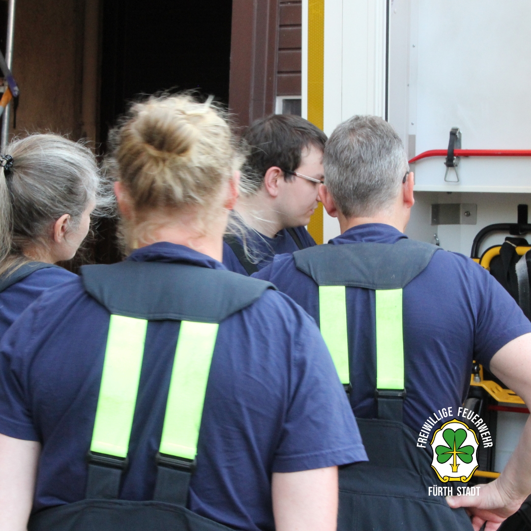 Zusätzlich stand ein Rettungswagen zur Verfügung, an dem unsere Einsatzkräfte den Ablauf und die Unterstützung der notfallmedizinischen Versorgung trainieren konnten. Ein weiterer Teil der Übung war der Transport einer verletzten Person mit der Schleifkorbtrage durch ein enges Treppenhaus – eine realistische und herausfordernde Situation, die im Einsatzfall höchste Konzentration und Zusammenarbeit erfordert.