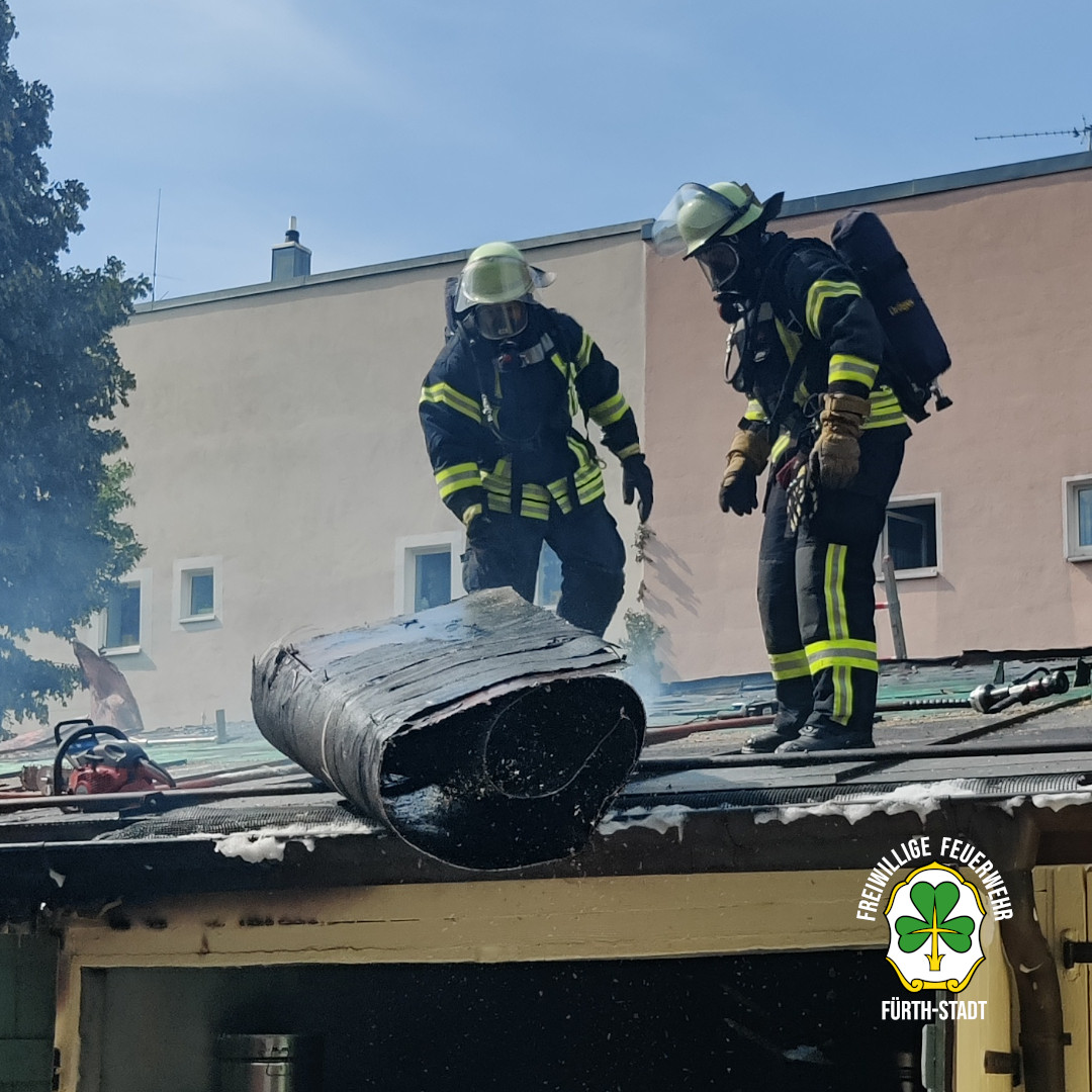 Ein Übergreifen des Feuers auf benachbarte Wohngebäude konnte durch die Löscharbeiten unseres ersten Löschfahrzeuges und der Berufsfeuerwehr verhindert werden. Das Feuer breitete sich vornehmlich unter dem Dach der Lagerhalle aus, was die Löscharbeiten erschwerte. Für die Lösch- und Nachlöscharbeiten wurde im Verlauf des Einsatzes sowohl das Dach des Gebäudes als auch die Zwischendecken und -wände durch mehrere Atemschutztrupps entfernt.